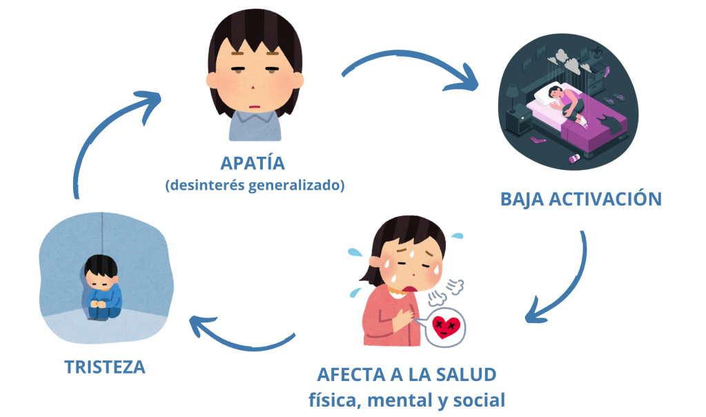 Si os dais cuenta, las consecuencias acaban reforzando el bucle que hemos explicado antes. El aislamiento es una consecuencia y a la vez un elemento que refuerza que la persona se mantenga en la depresión.